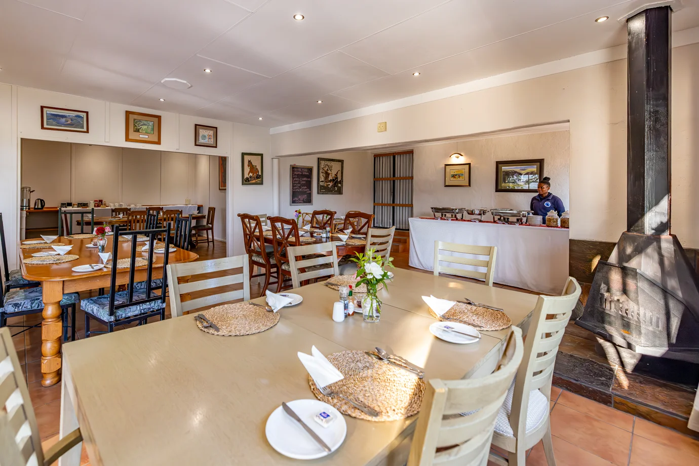 - Indoor and outdoor dining with views of the gardens, Makhaleng Valley, and Maluti Mountains.
